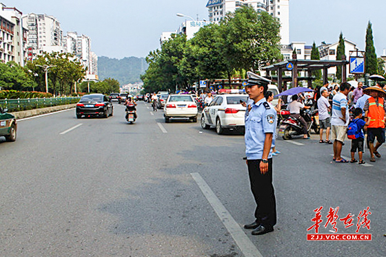 张家界市公安局交警支队直属一大队官黎坪中队民警按时到达崇实南校路口执勤岗点指挥交通