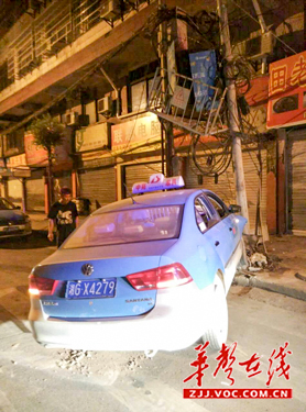 桑植县城一出租车驾驶员因夜间行驶过速,精力不集中一头撞向街边电线杆