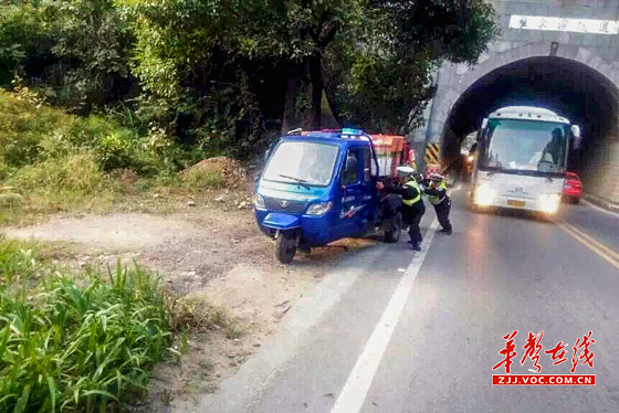 华声在线张家界站10月4日讯(通讯员 覃国良 李燕)10月4日上午7时许,一辆满载货物的三轮摩托车在张清公路桂家湾隧道内发生故障抛锚,导致其他车辆鸣喇叭提醒后纷纷避让,恰遇此时车流量大,埋下了巨大的道路交通安全隐患。一大早在此路段巡逻执勤的张家界市公安局交警支队直属一大队民警见状,马上和车主一起将故障车辆推移至隧道外的安全地带,迅速排除险情,及时消除了一起道路交通安全隐患。