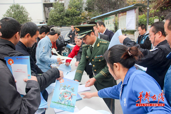消防官兵为群众发放消防安全手册