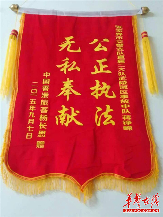 华声在线张家界站11月25日讯(通讯员 胡石友)11月25日上午,一个被退掉的境外包裹再一次被快递员送到了张家界市交警支队直属二大队,事故处理中队民警蒋峥嵘拆开后发现,是一名香港游客杨先生寄来的镶印有“公正执法、无私奉献”的锦旗。