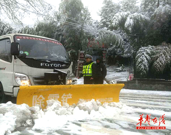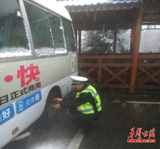 华声在线张家界站1月7日讯(通讯员 樊文佳婧)1月7日,武陵源风景区突降雨雪,导致张家界核心景区道路出现了积雪、冰冻现象,为了消除交通安全隐患,保障游客的出行安全,张家界市公安局交警支队直属二大队组织四中队民警全员上路,深入核心景区各重要路段、站场,查险情、排路障,并对环保客运车辆的安全防护设施逐台进行检查,要求景区运行的所有环保车辆必须安装防滑链,才可载客进入景区,以保证游客出行安全。同时,大队民警还协调相关单位采取铲积雪、撒盐等措施,从源头预防交通事故的发生,确保景区道路安全、畅通、有序,景区车辆运行安全。