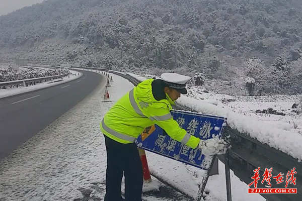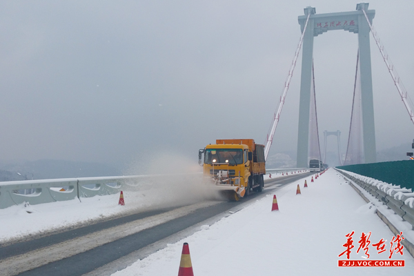 22日早上,受大雪影响,张花高速张家界境内全线出现积雪,高速交警除在沿线各主要桥梁驻守示警外,还增派警力在辖区路段对向不间断巡逻。通过警车牵引、警报器喊话等方式提醒车辆注意安全,同时,还对辖区内的交通提示牌进行了一次清理。张花高速澧水特大桥积雪严重,由于大桥横跨峡谷,桥面距底部的澧水河的最大高度近两百米,气象条件特殊,为防止积雪硬化结冰,高速交警紧急调来除雪车,对大桥进行除雪作业,并采取由警车牵引的方式来保障车辆安全、有序通行。