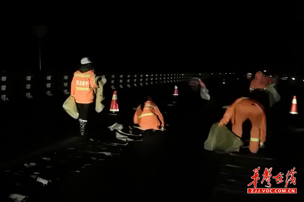 21日凌晨,张花高速澧水特大桥出现结冰现象,永定大队启动应急预案,对大桥采取管制措施,因桥梁结构特殊性,大桥无法使用融雪剂除冰,只能铺设麻袋。高速交警立即联系高速公路养护部门在桥面铺设麻袋,同时在大桥西往东方向桥头停放警车安排民警示警,通过警报器和喊话的方式提醒后方车辆减速慢行。
