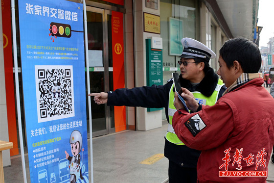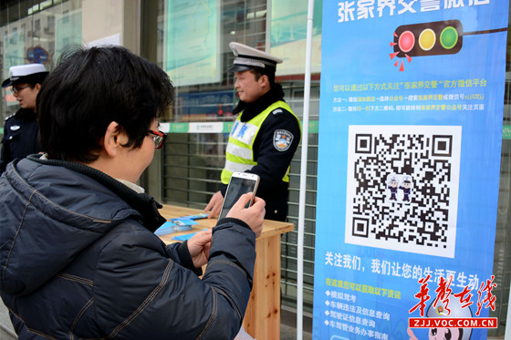 桑植交警为“张家界交警微信”打一句广告语:扫一扫,轻松考证;查一查,一目了然。