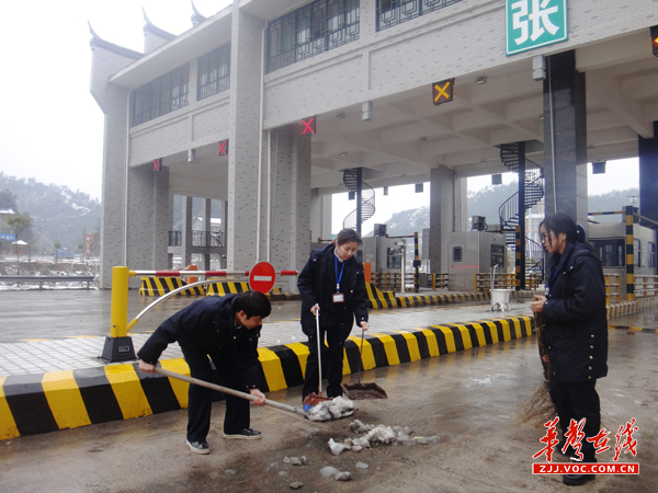 1月22日张家界市区迎来大雪,张家界西收费站工作人员抗冰除雪保道路安全畅通