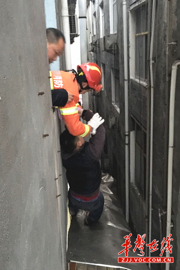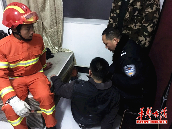 近日,在长沙工作的张某回到武陵源,打算把4岁的儿子从父亲处接到妻子的老家岳阳过年,却遭到了父亲的极力反对,两人因过年回谁家争吵不休,2016年1月31日17时许,张某一时想不开,竟从5楼跳下,幸而落在3楼防雨罩上,其父看到儿子跳楼后,立即打电话报警。赶来救援的军地坪派出所民警与消防官兵立刻救下掉落在3楼的张某。目前,张某已送至武陵源区人民医院救治。