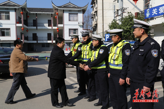 华声在线张家界站2月11日讯(通讯员 樊文佳婧)2月7日是2016年春节小长假第一天。武陵源区委常委、政法委书记向绪杰,副区长张德献、杨家进一行带着区委区政府以及全区人民对公安交通民警的亲切关爱来到张家界市公安交通警察支队直属二大队,看望慰问坚守在春运工作一线的公安交通民警,并送来了慰问金。