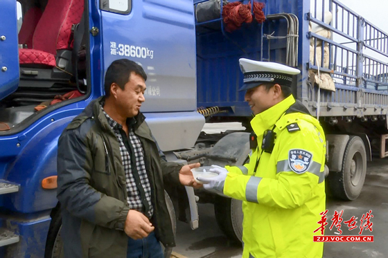 民警发现服务区休息区内停了一辆外地拍照的大货车,热心的青年团员立即端了一碗汤圆送给司机,司机紧紧握住民警的手表示感谢,民警也提醒他驾驶车辆时一定要注意安全。