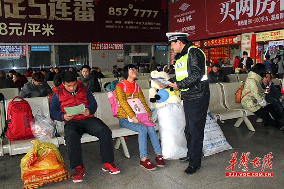 华声在线张家界站2月23日讯 (通讯员 李燕)元宵佳节在万人空巷的灯火中告一段落,随着大专院校学生返校、农民工返城务工,张家界市公安局交警支队直属一大队迎来春运期间最后一个客流高潮。2016年2月23日下午,交通民警深入中心汽车站,对人民群众以及客运车辆驾驶人开展道路交通安全相关知识宣传活动。