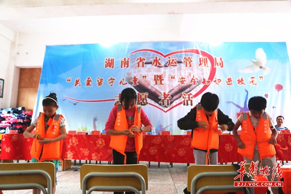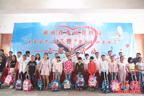 除了知识讲座,省水运管理局、县人民政府、市地方海事局、溪口镇人民政府、县地方海事处、溪口镇中心完小等领导还共同为留守儿童捐赠了安全教育读本、安全插页练习本、爱心礼包等物品。