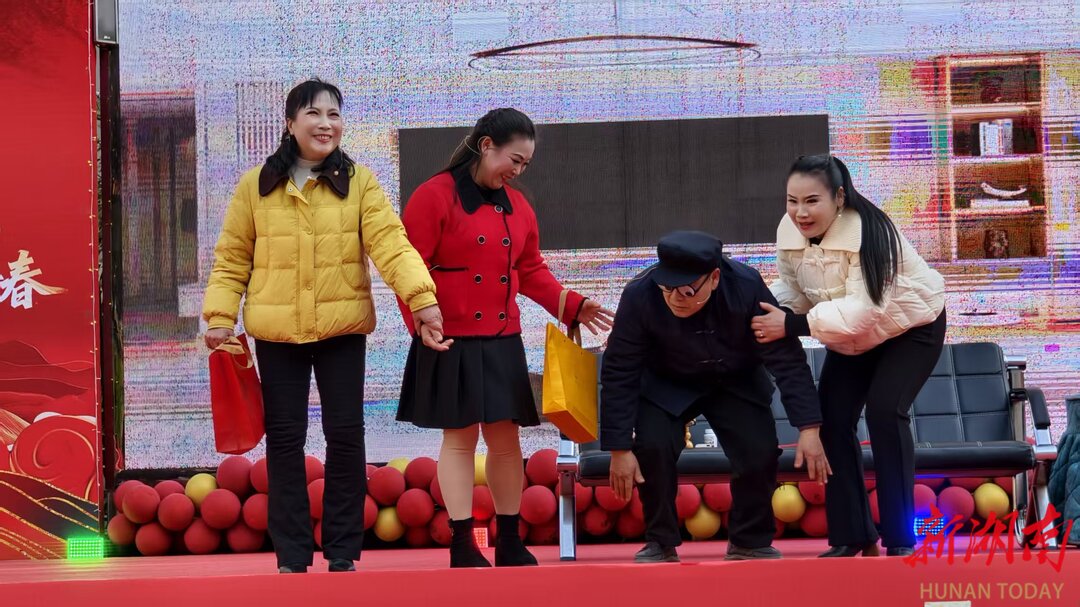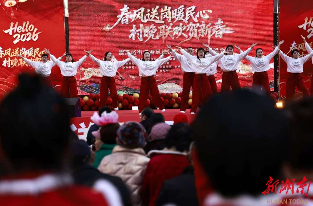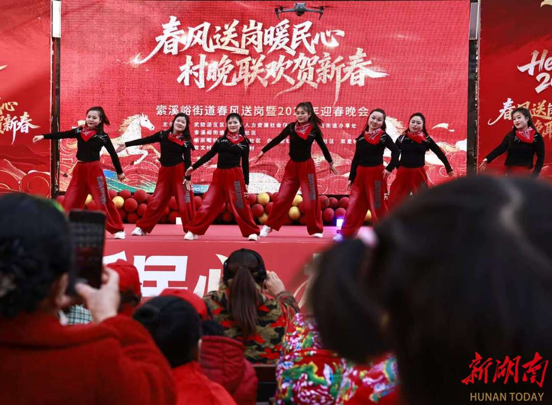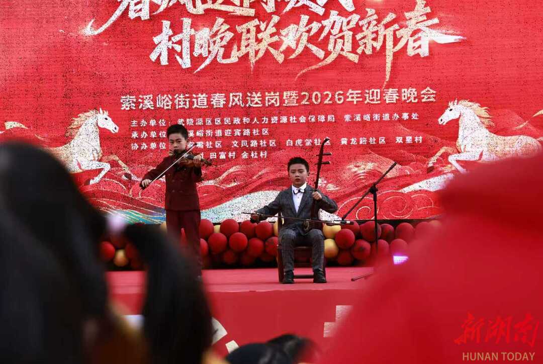 2月11日,张家界市武陵源区索溪峪街道办事处举办春风送岗暨2026年迎春晚会。演出现场歌舞飞扬,掌声雷动,涌动着欢乐、祥和、文明、和谐的节日文化氛围,由街道干部群众自编、自导、自演小品、舞蹈、舞龙、打溜子等丰富多彩的文艺节目,让参加联欢活动的群众感受到了浓浓的年味。通讯员 吴勇兵 摄