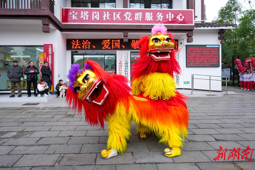 3月2日,丙午马年元宵节来临之际,张家界市永定区宝塔岗社区的居民们欢聚在社区党群服务中心,喜迎元宵佳节。当天,来自张家界学院的龙狮队为群众献上精彩演出,现场还开展了猜灯谜、吃汤圆等活动,处处洋溢着热闹喜庆的节日氛围。向韬 摄